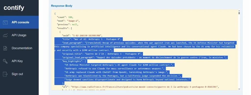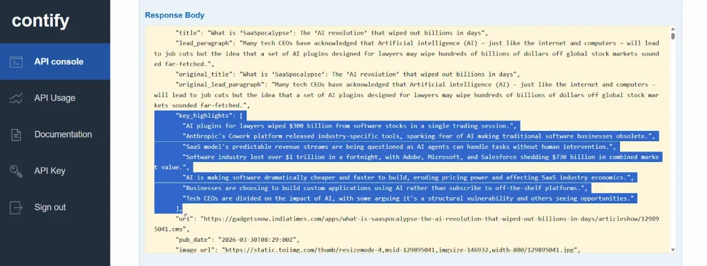 Contify automatically generates AI-powered key highlights for every story and distributes them in API output, condensing each article into quick, scannable bullet points. The firm’s clients no longer needed to read full articles to assess strategic value. They could review the highlights, identify what mattered, and act on it immediately.