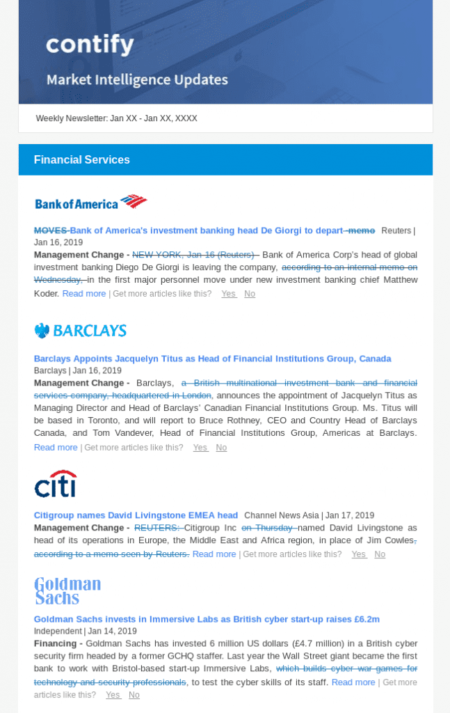 Contify leverages summarization algorithms for extracting insights, but current algorithms fall short at understanding the context of information and fail to extract accurate insights. Contify technology was able and extracts important facts and quotes from the updates, but with some errors and omissions. To address this limitation, Contify supported the process with the help of domain analysts, who reviewed and edited the insights. This is where Contify’s hybrid system, with intuitive workflows, truly excels. Example of insights: