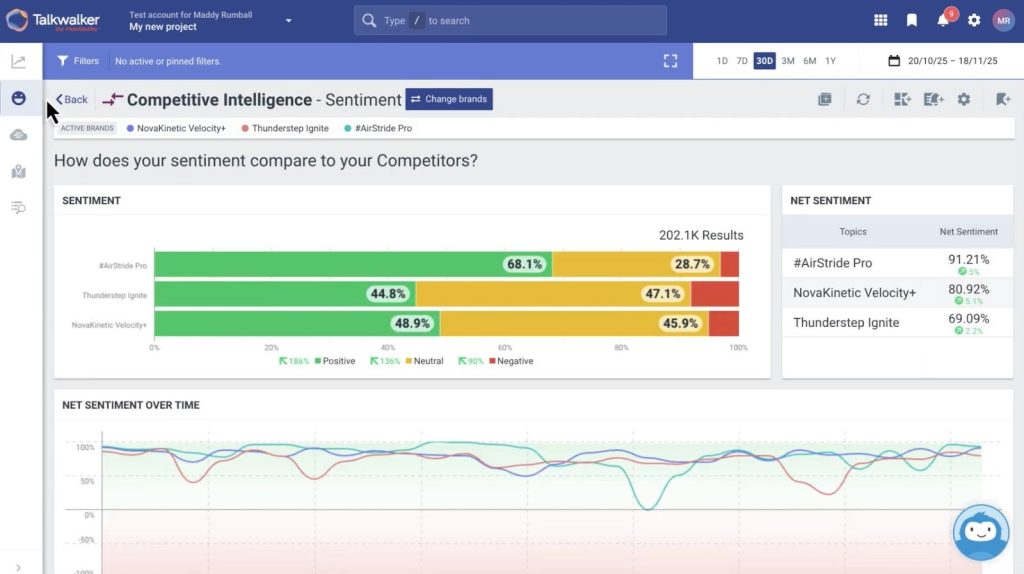 - Competitive Benchmarking and Share of Voice: Teams can define a competitive set and benchmark brand performance against rivals across sentiment, coverage volume, channel engagement, and share of voice over time, tracking how competitor campaigns and announcements are landing with audiences.