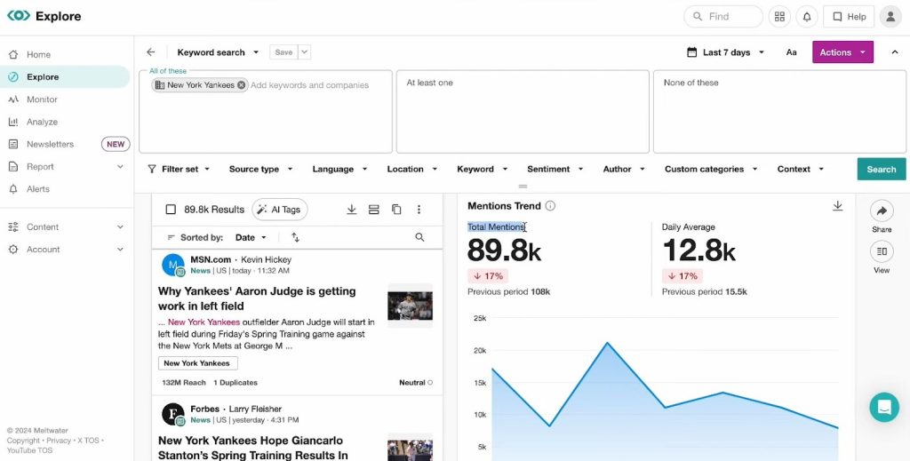 - Cross-Channel Monitoring Across News and Social: Meltwater tracks major social platforms (X, Facebook, Instagram, YouTube, TikTok, Snapchat, Reddit) as well as news, blogs, forums, and broadcast media. It offers a 15-month rolling archive and full X Firehose access for historical analysis and year-on-year comparisons.